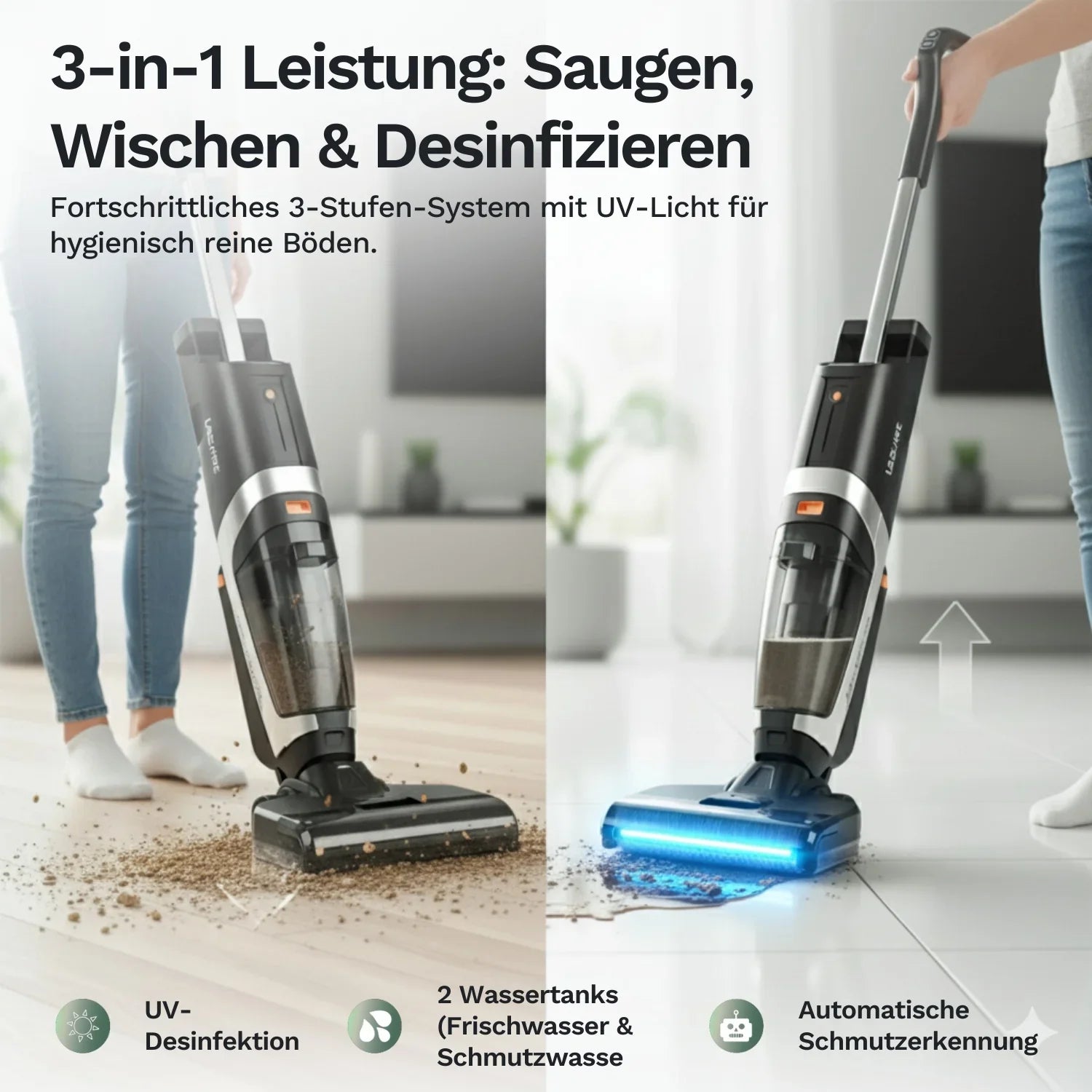 Toto otestované předváděcí zařízení kombinuje vysávání, vytírání a UV dezinfekci v jednom přístroji a zajišťuje hygienicky čisté podlahy. S až 14 000 Pa sací síly Lazurec L5 spolehlivě odstraňuje prach, nečistoty, kapaliny a zvířecí chlupy. Díky automatickému rozpoznání povrchu a nečistot se přístroj optimálně přizpůsobí různým typům podlah. Výkonná baterie umožňuje až 45 minut bezdrátového čištění.Otestovaný předváděcí model byl pečlivě zkontrolován, vyčištěn a je technicky bez závad. Mohou se vyskytnout drobné známky používání, které však neovlivňují funkčnost.