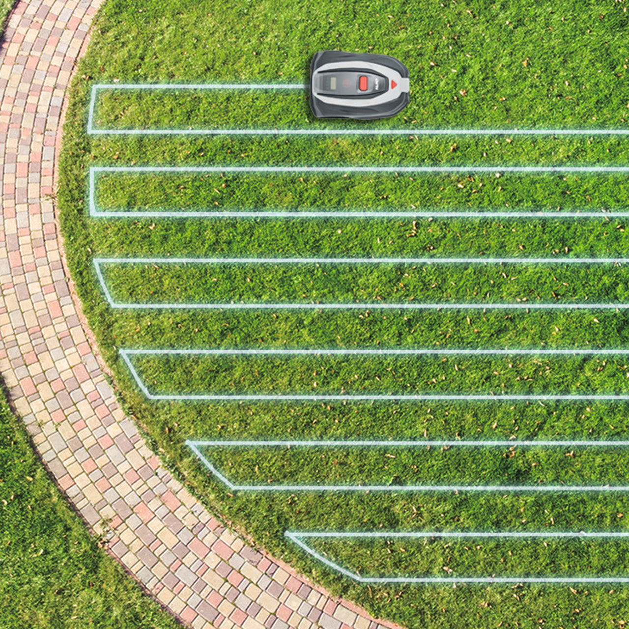 Je nach Flächenform arbeitet der Mähroboter systematisch in Bahnen oder flexibel im Zufallsmodus und sorgt für ein gleichmässiges, sauberes Schnittbild.